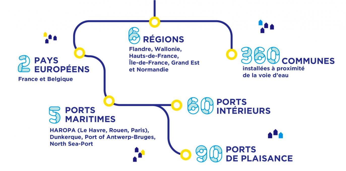 - La construction d’une nouvelle infrastructure fluviale, le Canal Seine-Nord Europe, qui reliera le bassin de la Seine au bassin de l’Escaut et à d’autres grands bassins européens (Meuse, Rhin).